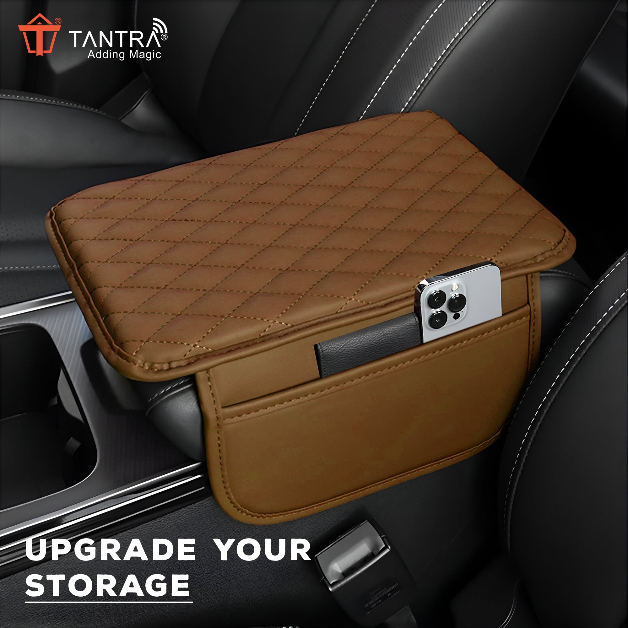 TANTRA Car Armrest Cover Cushion with 2 Storage Bags - Soft, Comfortable, Non-Slip Protector for Vehicle Center Console - Waterproof, Durable, and Stylish ( Tan )